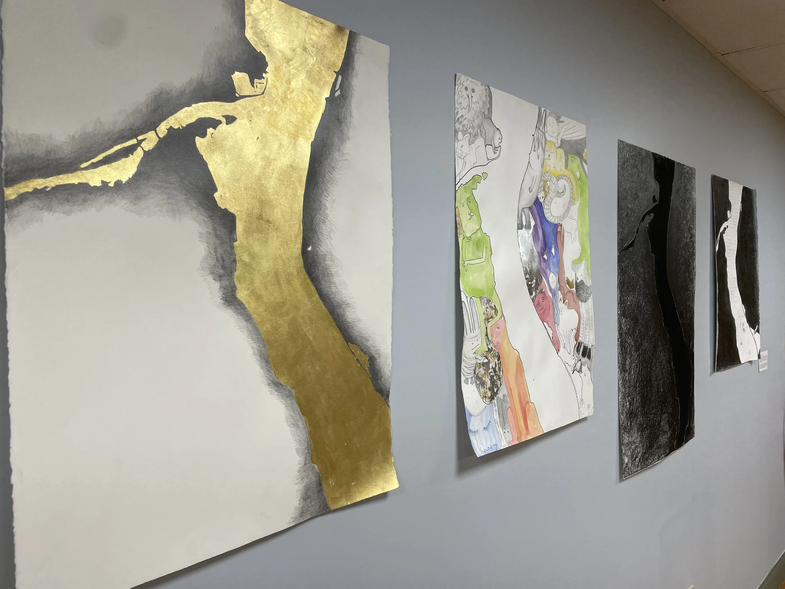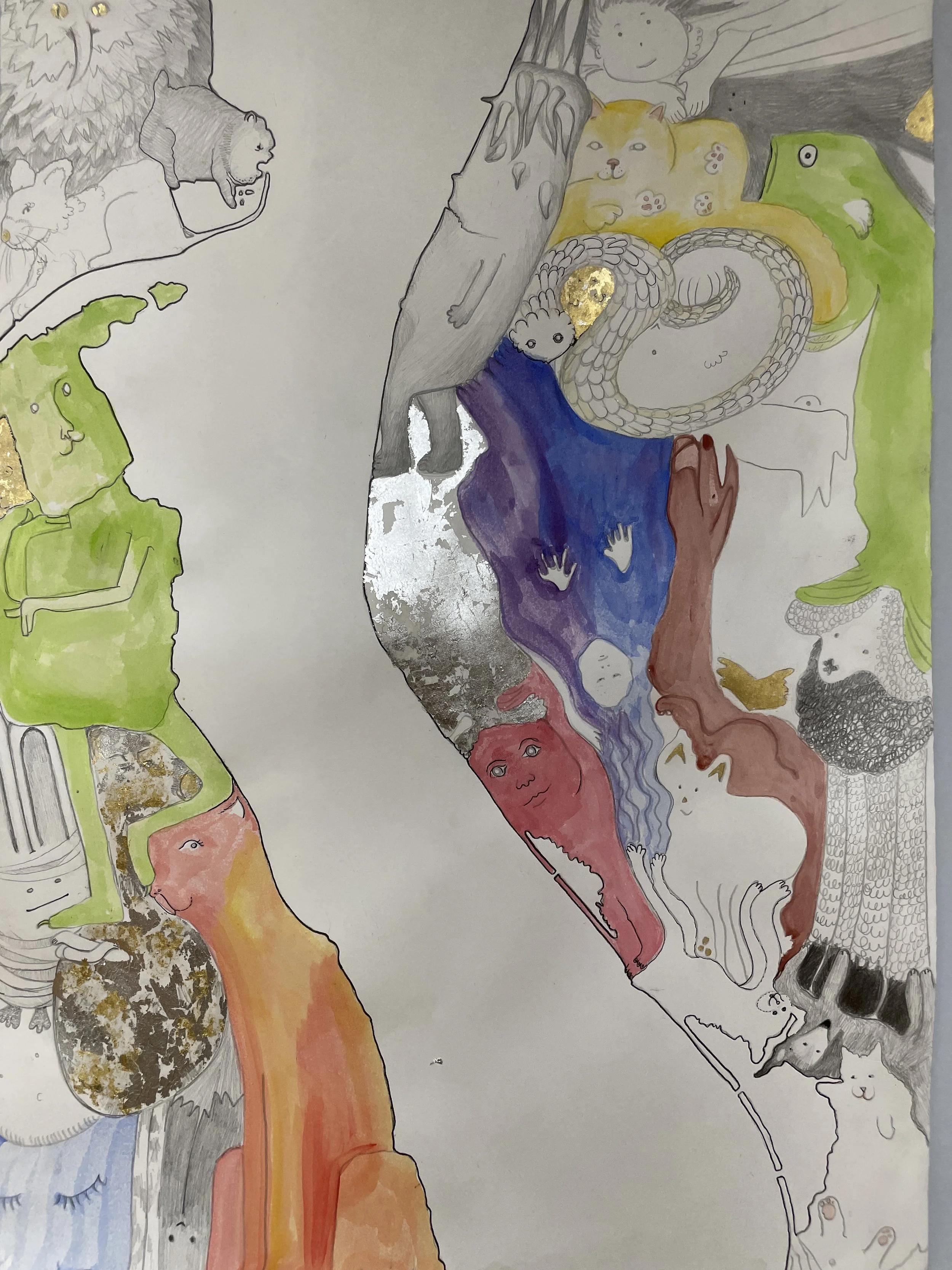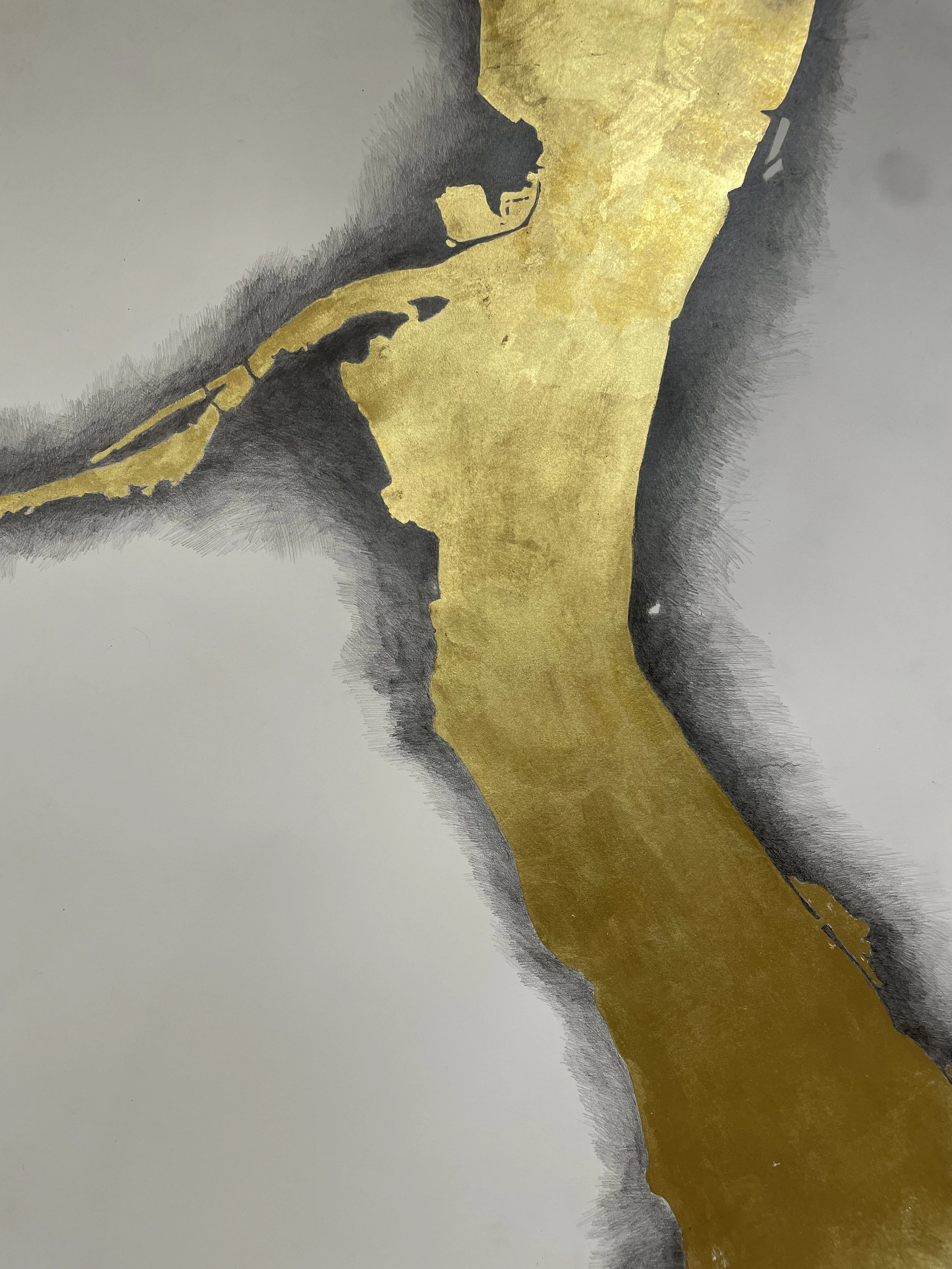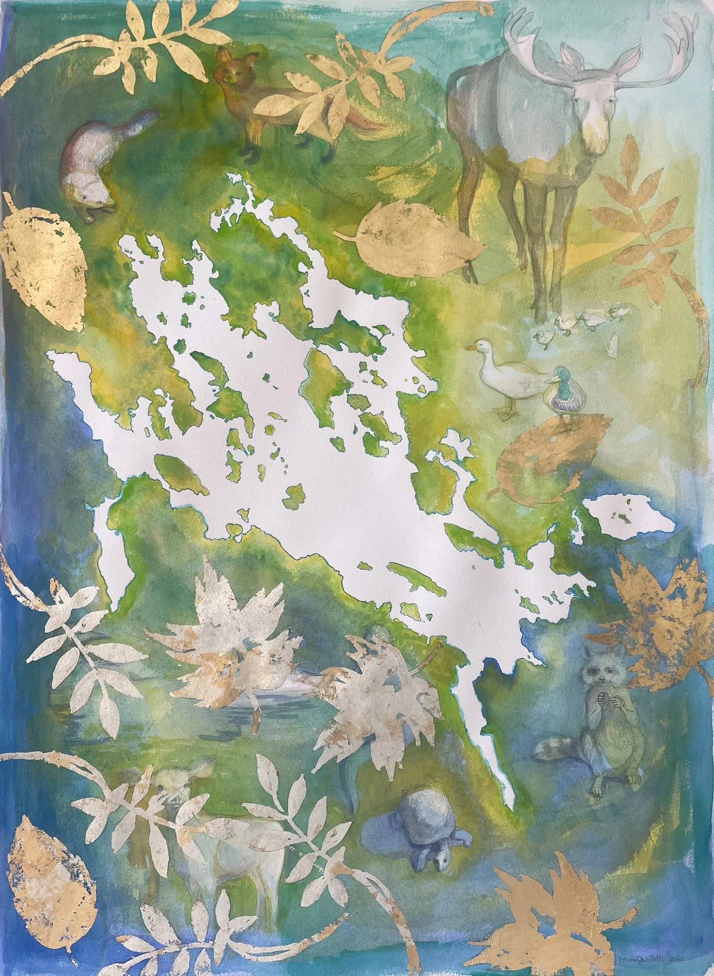 lake winnepesaukee (wild life), watercolor, gold leaf and graphite on paper, 30 x 22 inches