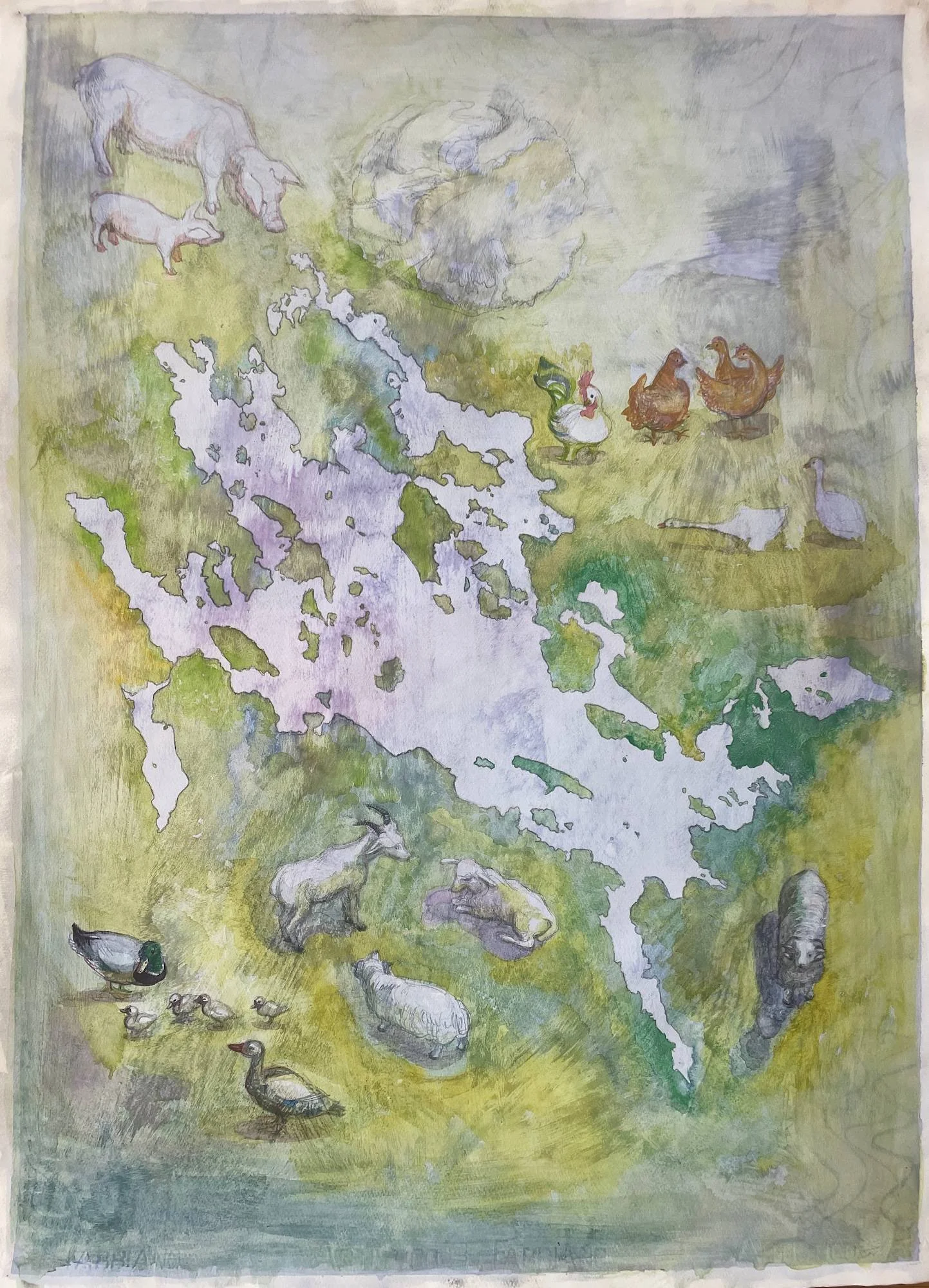lake winnepesaukee (domestic animals), watercolor, graphite on paper, 30 x 22 inches